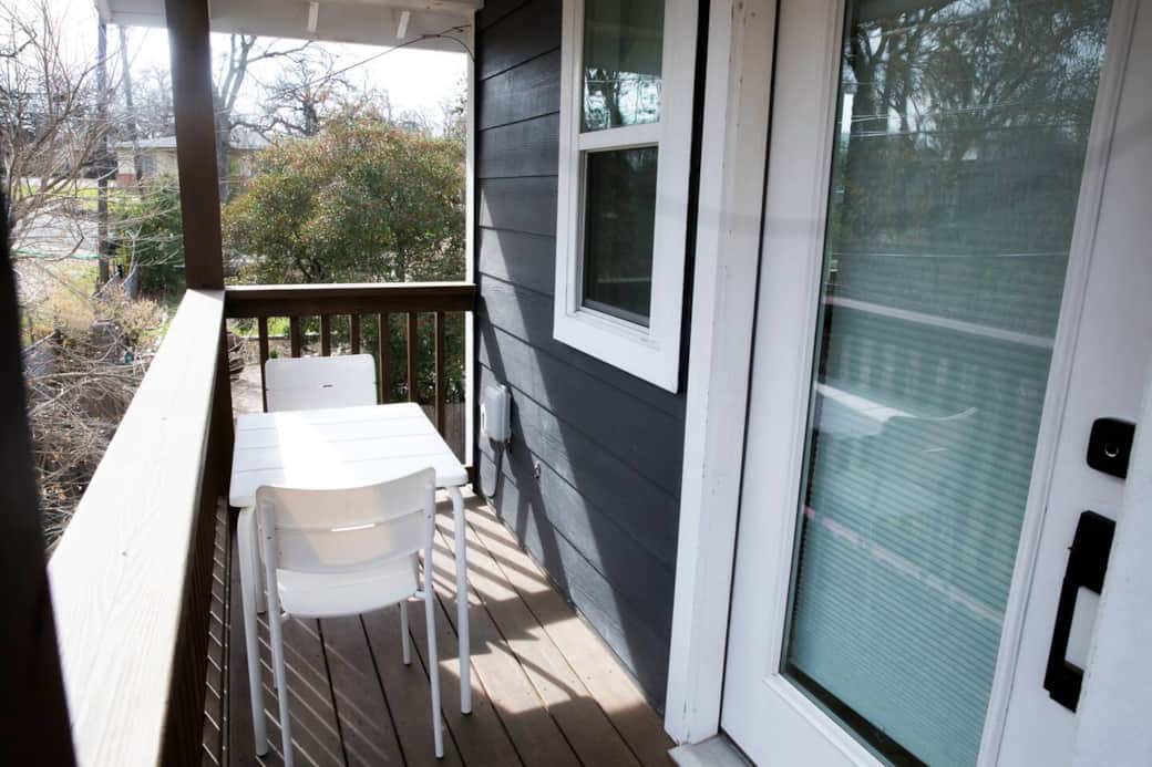 The treehouse has an airy, light-filled main room with views of neighborhood trees, high ceilings, comfortable seating, smart TV, and full kitchen.