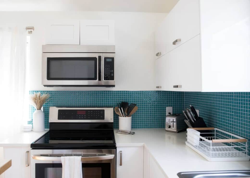 Our kitchen has a full size stove and dishwasher, microwave, coffeemaker, electric kettle, and toaster, a full set of dinnerware, pots & pans, and bakeware, and cooking essentials like oils, and spices.